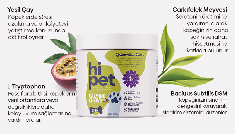 Köpeğinizin stres, anksiyete ve hırçınlık sorunlarını gidererek hiperaktif davranışlarını azaltın. HiPet Çiğnenebilir Tableti ilk kullandığınız anda dostunuzun stresli ve kaygılı olduğu durumlardaki değişimlerini fark edeceksiniz.