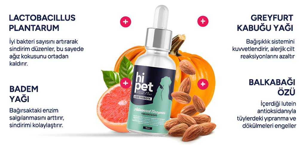 HiPet, dostunuzun sağlığını desteklemek için kapsamlı bir şekilde formüle edilmiştir. İçeriğindeki probiyotikler ve sindirim enzimleri, köpeğinizin sindirim sistemini dengeler ve mide kaynaklı ağız kokularını etkili bir şekilde giderir. Veteriner hekim olarak, bu ürünün içeriğinde bulunan doğal ve bilimsel olarak desteklenen bileşenlerin köpekler ve kediler için için güvenli ve etkili olduğunu belirtmek isterim. Gönül rahatlığıyla kullanabilirsiniz.